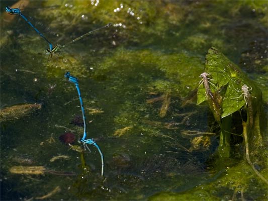 Eiablage Azurjungfern und "merkwürdige Tiere" alias Larvenhäute (Exuvien) (Danke an Norbert Baasner für die Artbestimmung im April 2010) ...mehr über unsere → Schlank-Libellen im Glemstal |