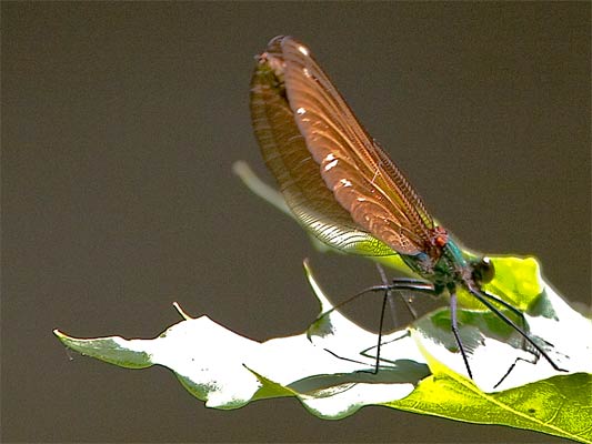 Die Weibchen der Blauflügel-Prachtlibelle (Calopteryx Virgo) sitzen im Juni an bestimmten sonnigen Stellen auf Blättern oberhalb der Glems. In der Nähe schwirren dann auch die Männer herum.