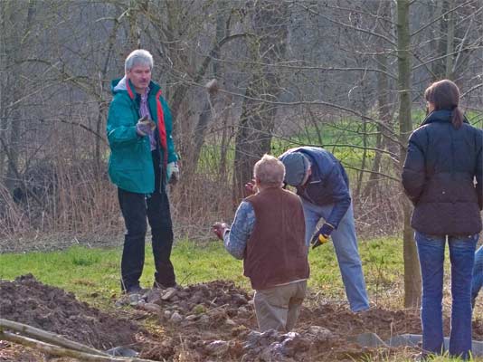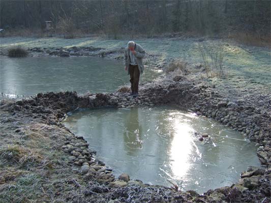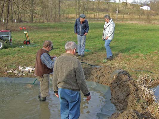| Der Nebenteich wird neu angelegt | Und mit Wasser gefüllt | dieser Teichmolch wurde umgesetzt in den grossen Teich. → Teichmolch-im-Glemstal |