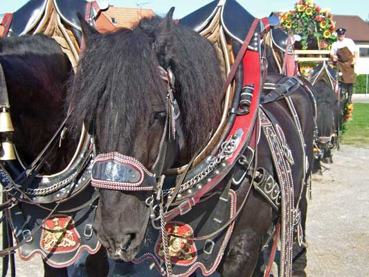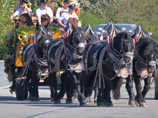 eine schön geschmückte sechsspännige Bierkutsche beobachten. Passend zum