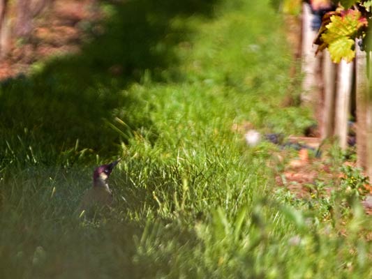 Zwischen den Reihen der Weinreben sahen wir einen Grünspecht auf dem Boden