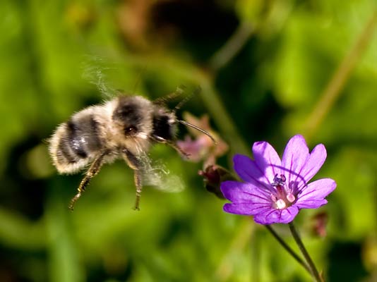 die sehr seltene Sandhummel (Bombus veteranus) oder eine stark ausgebleichte Waldhummel (Bombus sylvarium) (Danke an Martin X für die Artbestimmung in 5/2011) im Anflug auf Berg-Storchschnabel (Geranium pyrenaicum) ...mehr über unsere → Hummeln-im-Glemstal |
