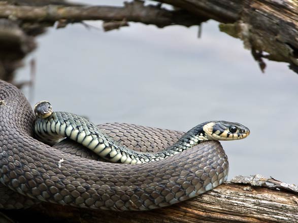 braune Ringelnatter am Pfaffensee: Halbmondflecken hinter dem Kopf. Dunkle Flecken auf dem Rücken. | Dick und dünn: zwei Ringelnattern am Bärensee | Grössenvergleich: Mandarinente und 3 Ringelnattern: Das Foto zeigt die beachtliche Grösse dieser Ringelnattern. | Habitat der Ringelnattern am Bärensee |
