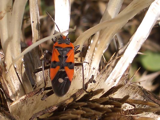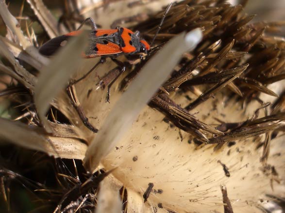 Die Ritterwanze (Lygaeus equestris) wurde zum Insekt des Jahres 2007 gekürt. Unser Exemplar war lange Zeit auf dieser Silberdistel unterwegs. Die Wanze ist rot mit schwarzen Zeichnungen. Die dunkle Membran ist mit einem weißen, runden Flecken gezeichnet. Sie gehört zur Familie der Langwanzen.