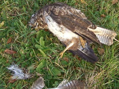 toten Mäusebussard wurde auch gerade das Feld gemäht. Einige Federn lagen neben