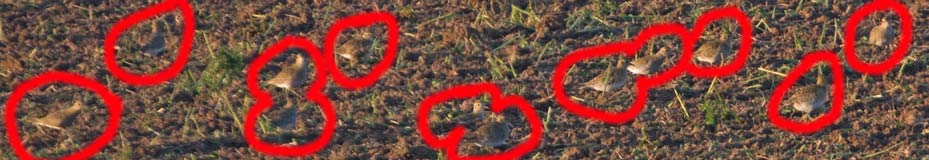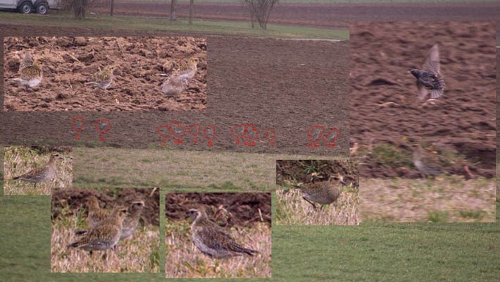 Goldregenpfeifer auf dem Acker, einige Exemplare vergrößert. Foto gibt es auch in höherer Auflösung in der "Cloud". Um es anzuzeigen: Klicken Sie hier |