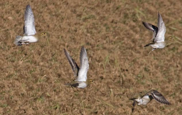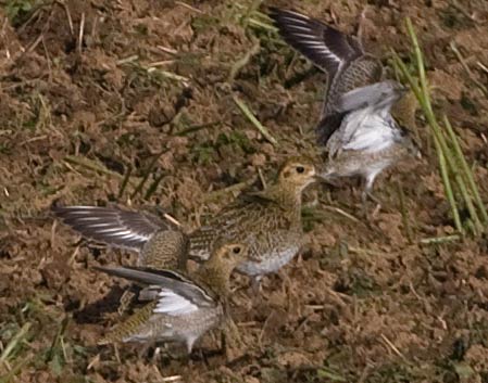 Goldregenpfeifer herumliefen, schienen sie auf dem Boden was zu suchen. Der ganze Trupp war