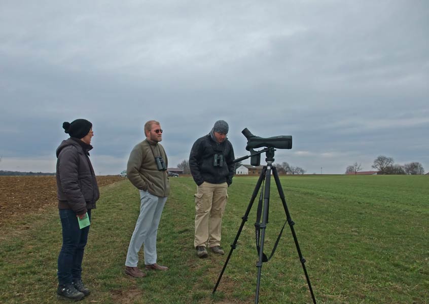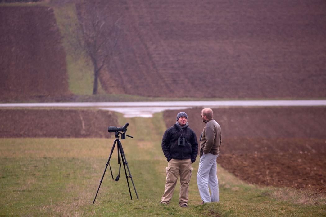 Jochen Völlm und Jürgen Blessing beobachten die Goldregenpfeifer in Schöckingen |