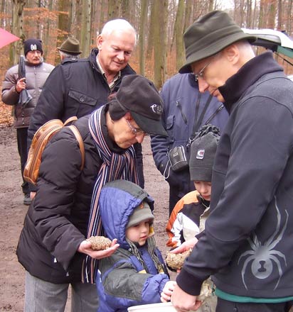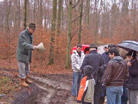 Wolfram Bock zeigt eine seltene natürlich entstandene Baumhöhle. (abgesägt an einem gefällten Baum) |