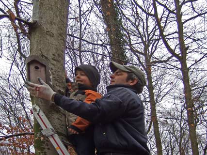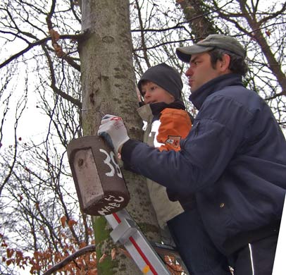 Thomas Schaller und Max hängen den geputzten Nistkasten wieder auf. | So hängt er wieder richtig: An solch dünnen Bäumen kann er noch viele Jahre hängen |