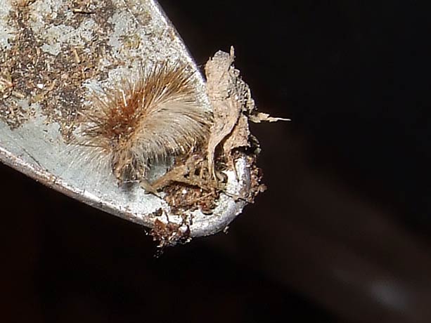 Diese kleine haarige Raupe rechts war im Nistkasten Nr. 41. Wir haben