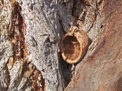 aber leider wohl keine Haselmaus (wegen der scharfen Bruchkanten ist diese Haselnuss wohl nicht von einer Haselmaus bearbeitet worden) |