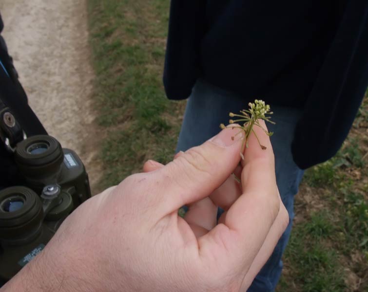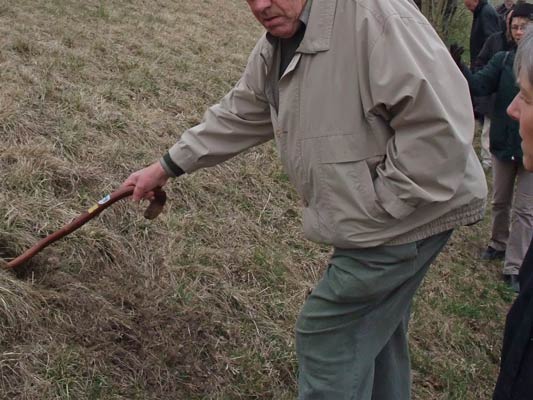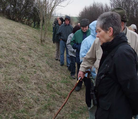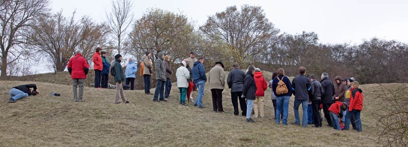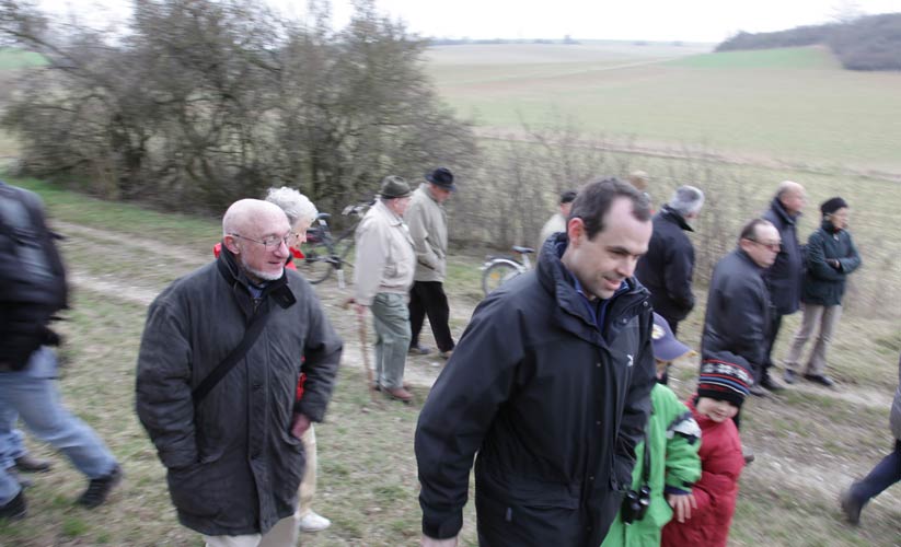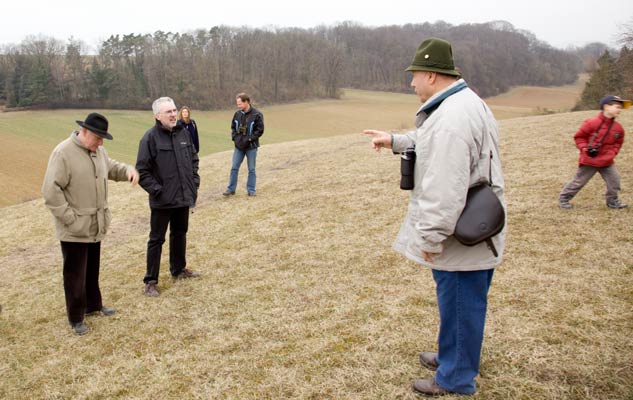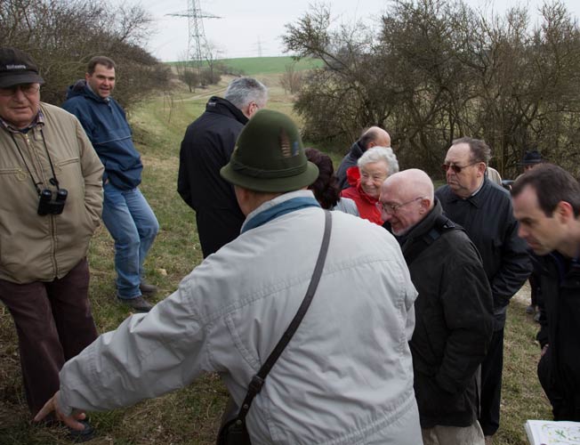 Vor einer Woche war in der Diskussion, die Wanderung um eine Woche nach hinten zu verschieben, weil noch keine Blüte sichtbar war. Ernst Seitz war optimistisch, denn die Küchenschellen waren ca. 1 cm sichtbar. Obwohl die Woche sonnig war, sind die Küchenschellen kaum weiter. Nur an den jeweils wärmsten Stelle der drei Heiden sind einige wenige Blüten geöffnet. Ernst Seitz meint: "die Küchenschellen sind gegenüber letztem Jahr um 3 Wochen zurück". In manchen Jahren können Sie 3000 Blüten zählen. Heute waren erst ca. 20 Blüten geöffnet.
