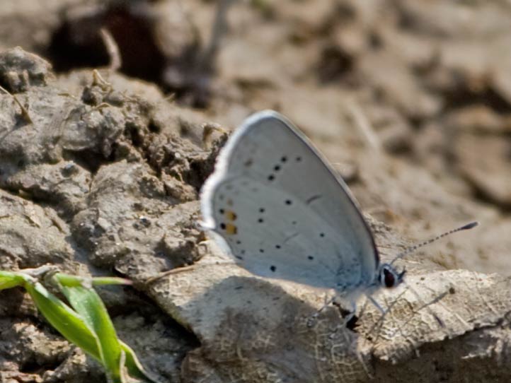 Der Bläuling unten rechts hat es in sich. So einen Bläuling habe ich noch nie fotografiert in unserer Gegend. In meinen Bestimmbüchern ist er nicht drin. Über den Bläuling habe ich stundenlang gegoogelt ohne Ergebnis. Bei einer Bekannten in deren Bestimmungsbuch bin ich dann fündig geworden. Es handelt sich um den kurzschwänzigen Bläuling. (cupido argiades). Wikipedia schreibt" Der Kurzschwänzige Bläuling ist der zweitkleinste Bläuling in Mitteleuropa. Charakteristisch für die Art sind je ein kurzes Schwänzchen an den Hinterflügeln. Diese drei Falter hatten alle eine bei Faltern äußerst beliebte Pfütze entdeckt. Sie und weitere Falter saßen dort und schlonzten am Schlamm. Vielleicht waren bestimmte Mineralien drin.