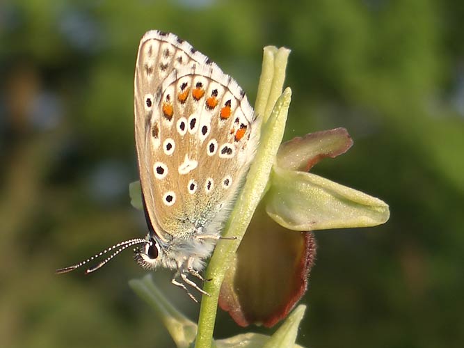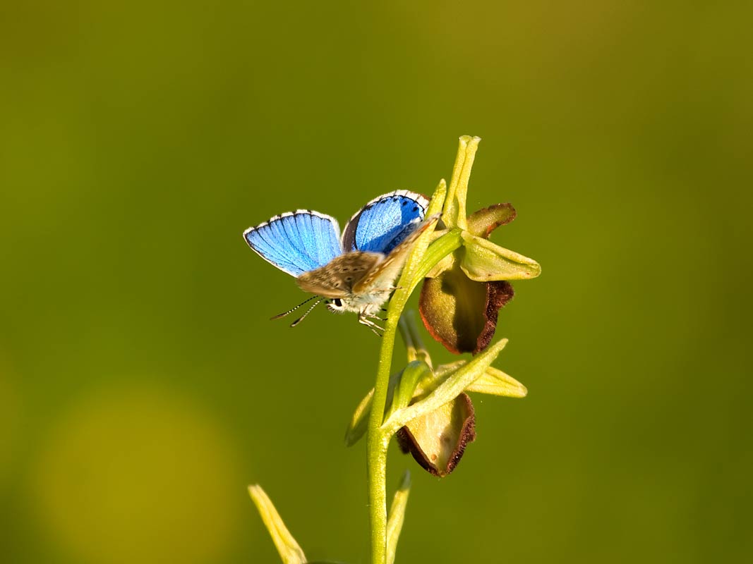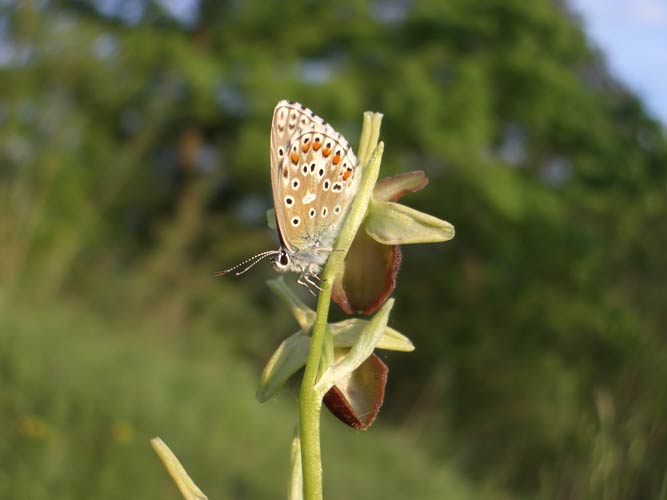 fotografiert einen himmelblauen Bläuling auf einer Spinnenragwurz ... mehr über unsere → Orchideen im Glemstal → Bläulinge im Glemstal → das NSG Hammelrain |