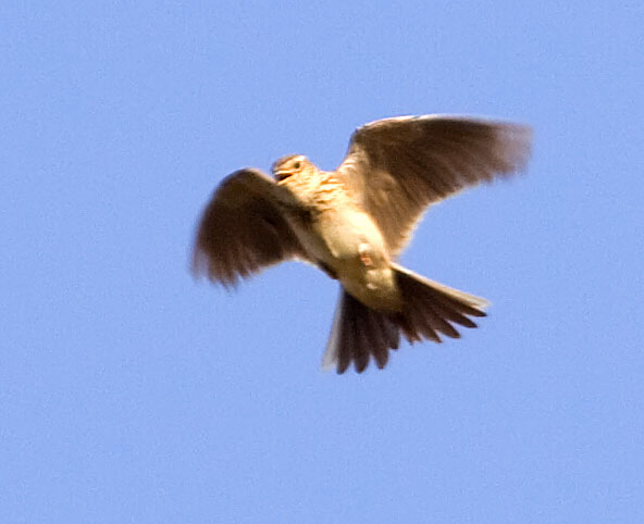 Feldlerche (Alauda arvensis) beim Singflug über den Kornfeldern ...mehr über unsere |