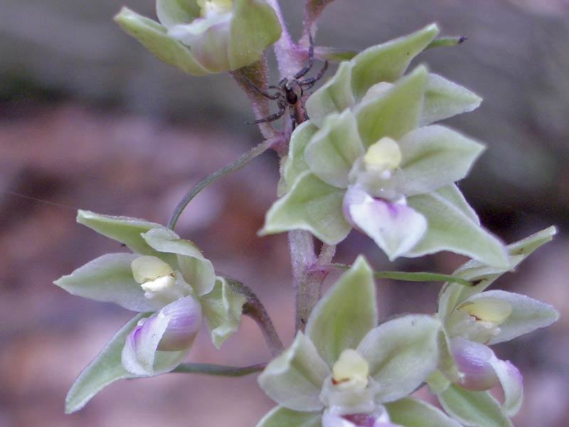 am "ersten Standort": eine Ameise Formica sp. (Formica fusca?) auf der Orchidee Violette Stendelwurz (Epipactis purpurata) ...mehr über unsere → Orchideen im Glemstal → Ameisenarten im Glemstal |