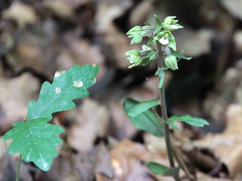Der Blütenstand im Überblick: Die grünen Blätter sind außen eher nicht gewellt, also keine Müller-Stendelwurz |