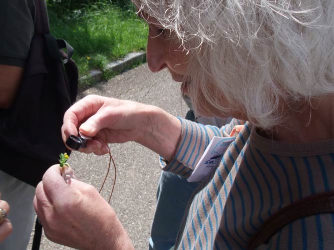 | Fritz Plachetta leitet diese Exkursion | Fritz Plachetta zeigt Wiesen-Pippau (Crepis biennis) |