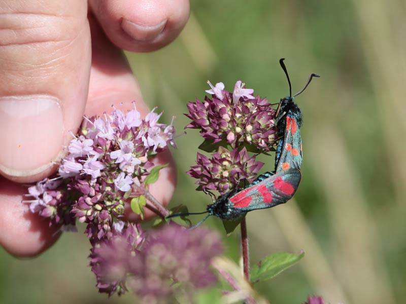 | Falter | 6-Fleck-Widderchen | Zygaena filipendulae | selten, mehr über → Widderchen-im-Glemstal |