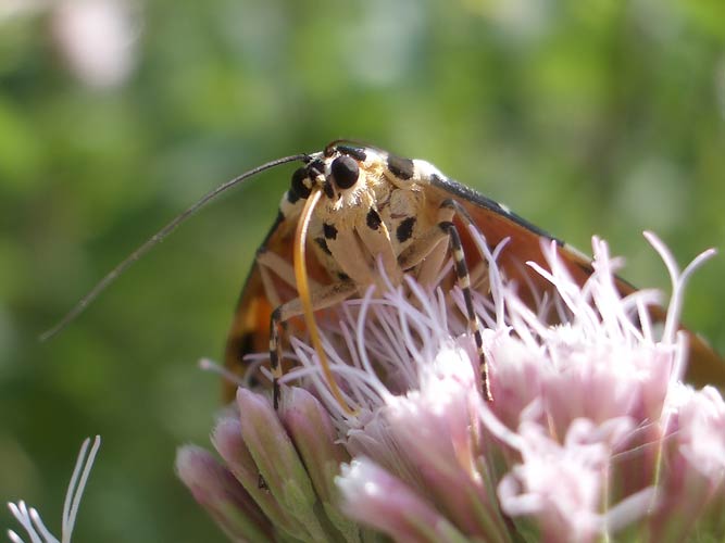 russischer Bär (euplagia quatripunctaria) trinkt aus der Blüte vom Wasserdost (Eupatorium cannabinum) ...mehr über unsere → Bärenspinner im Glemstal → Korbblütengewächse im Glemstal |