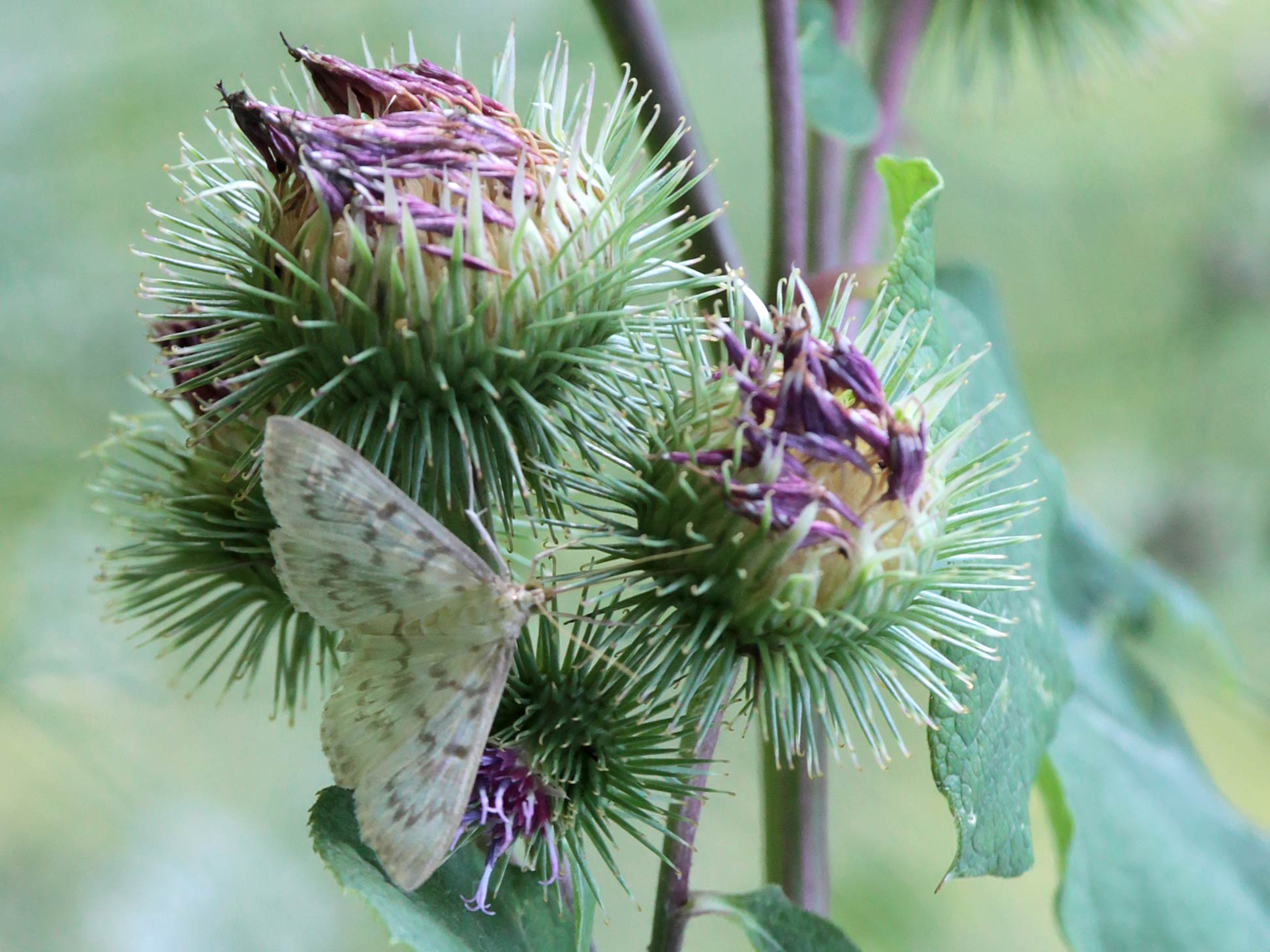 große Klette (Arctium lappa) mit Nesselzünsler Pleuroptya ruralis ...mehr über unsere → Korbblütler im Glemstal → Zuensler im Glemstal |