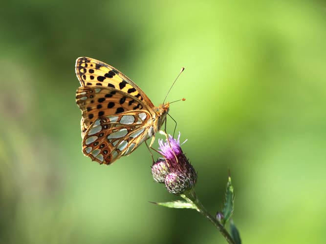 Perlmutterfalter (Issoria lathonia) auf Kratzdistel (Cirsium arvense) Robert Flogaus-Faust schreibt mir am 8.10.2012: "ist ganz sicher kein Cirsium vulgare, dürfte aber Cirsium arvense sein." ...mehr über unsere → Edelfalter im Glemstal → Korbblütler im Glemstal |