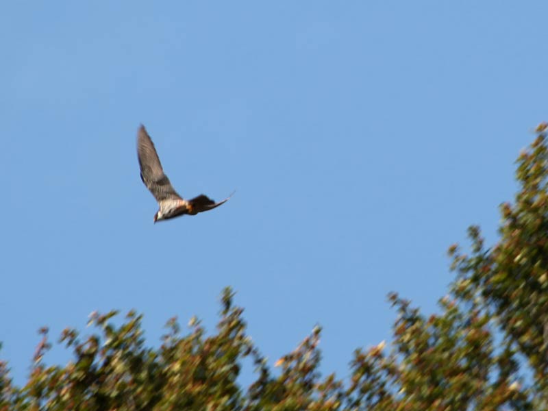 derselbe Vogel direkt nach dem Abflug weißer Kopf, rote Hosen: ein erwachsener Baumfalke (falco subbuteo) ...mehr über unsere → Baumfalken im Glemstal |
