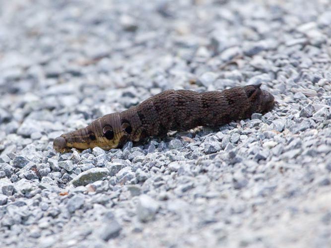 eine ca. 7cm lange Raupe auf dem Weg mitten im Hemminger Zeilwald. Die Raupe kann ihren Kopf extrem in die Länge ziehen wie auf diesem Foto: mittlerer Weinschwärmer (Deilephila elpenor) ...mehr über → Raupenarten im Glemstal |
