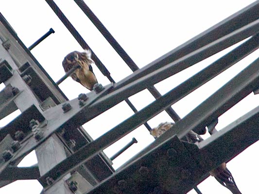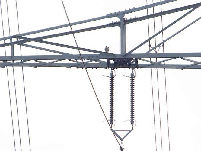 ganz oben auf einem hohen Strommast. Man hört sie öfter laut schreien. Etwa wie ein Sperber.
