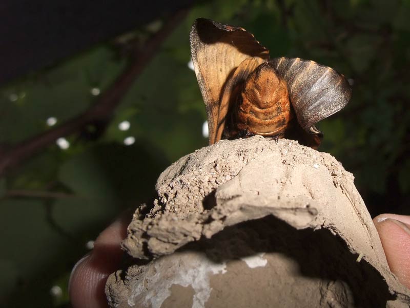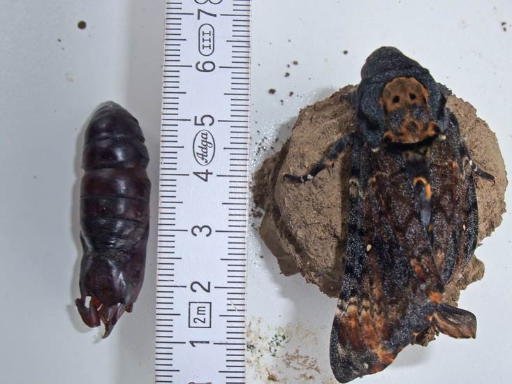 dass der Totenkopfschwärmer geschlüpft ist. Die Puppe hatte sich in der Erde
