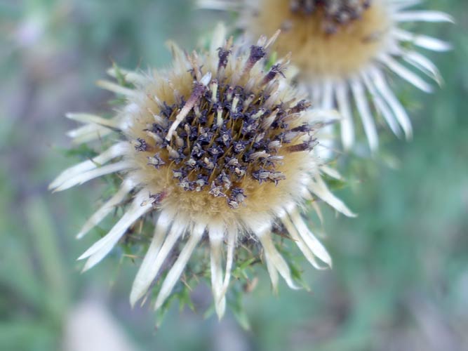 Golddistel (Carlina vulgaris): bei der alten Blüte sind die Röhrenblüten überall und schon verblüht ...mehr über unsere → Korbblütengewächse im Glemstal |