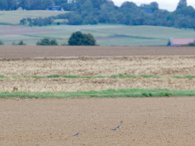 Ein kleiner Trupp von zwölf Bachstelzen, einer hellgelben Stelze und einer ganz gelbe Stelze waren auf diesem abgeernteten und sehr feinscholligem Feld auf der Höhe südlich des Schwieberdinger Golfplatzes. Vermutlich auf dem Zug und beim Rasten. Offenbar braucht man die Profile, um die Schafstelzen zu unterscheiden.