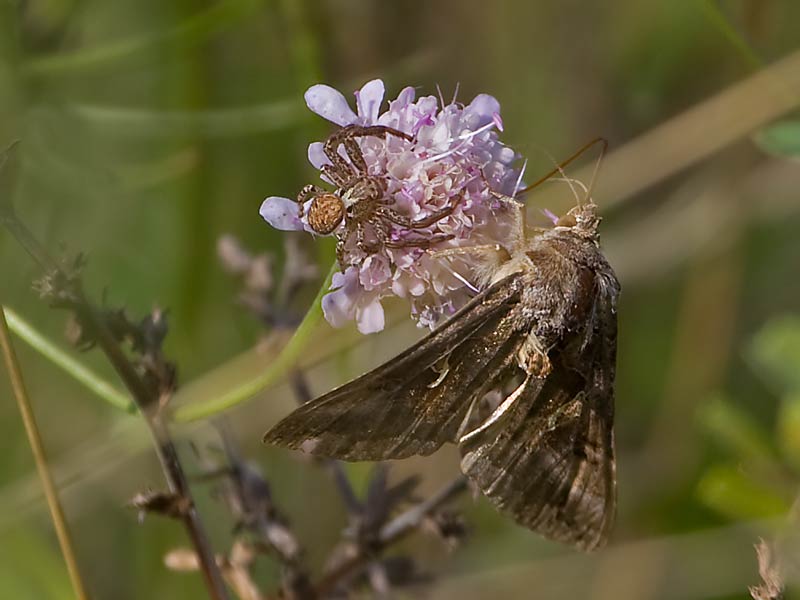 Gammaeule mit Krabben-Spinne auf Wiesenwitwenblume ...mehr über unsere → Eulenfalter im Glemstal → Kardengewächse im Glemstal |