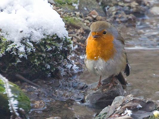 Das Rotkehlchen (Erithacus rubecula) badet bei -5°C im eiskalten Leudelsbach → Rotkehlchen im Glemstal |
