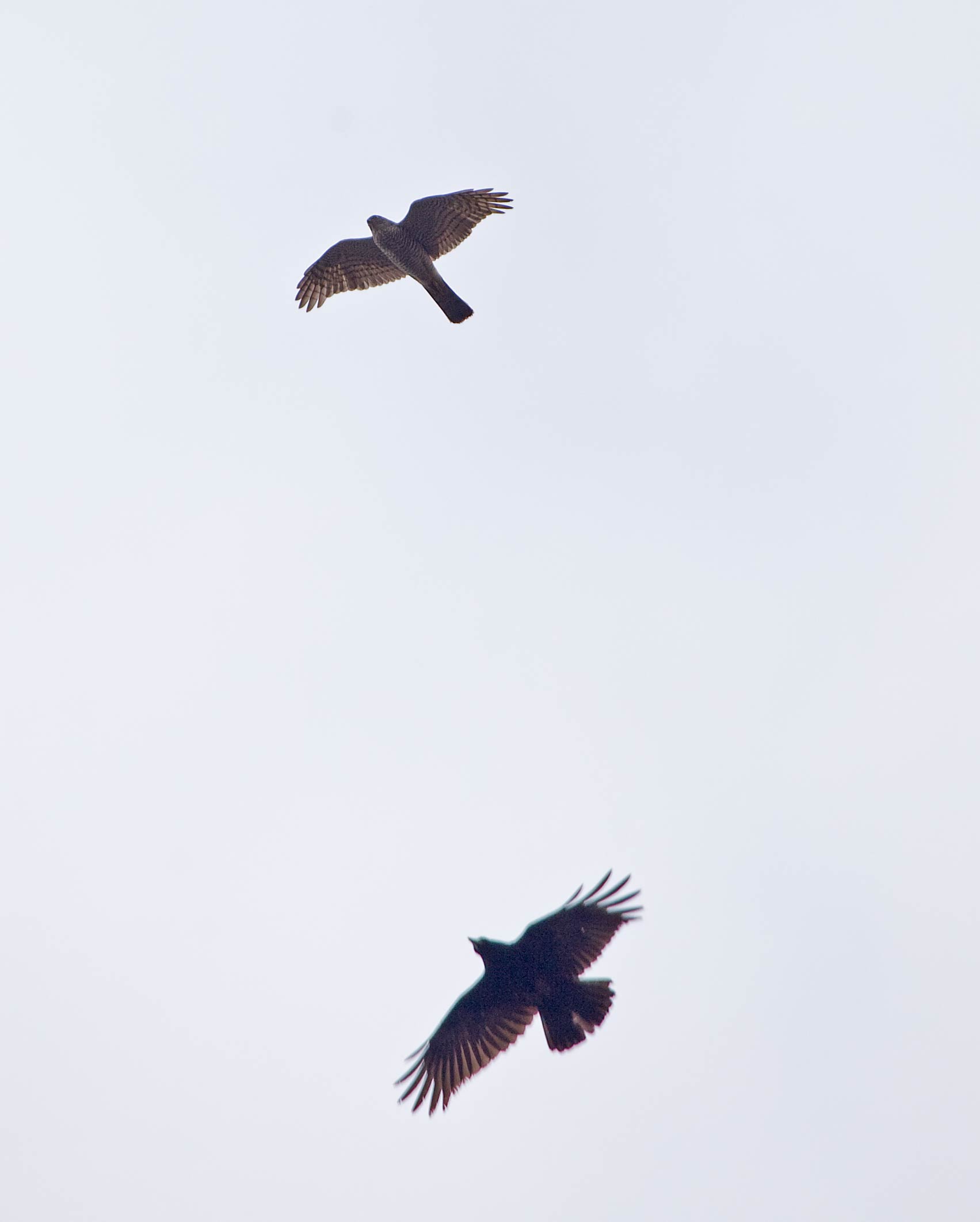 ein Rabenkrähe hasst auf einen Greifvogel (Sperber?) ...mehr über unsere → Rabenkrähen im Glemstal → Greifvögel im Glemstal |
