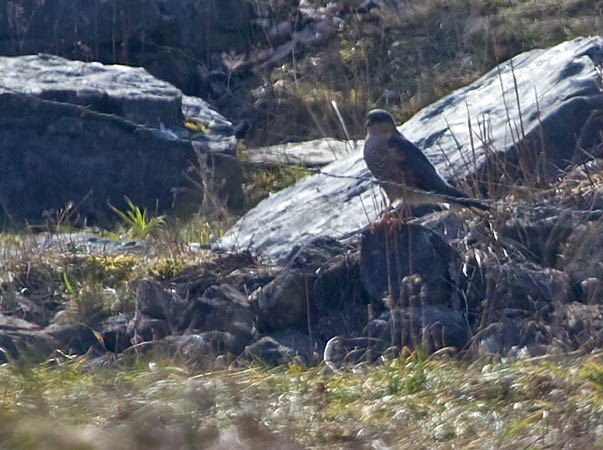 am nächsten Tag: Greifvogel beim Biotop im Steinbruch: - Brust quergebändert - etwas rotorange drin - Oberseite blaugrau - dunkle Kappe - kein "Bart" -> Sperber |