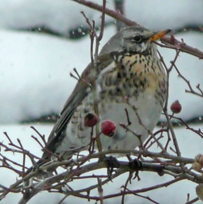 Diese Wacholderdrossel im Schneefall mochte Hagebutten und rastete einige Tage in einem Garten ...mehr über unsere → Wacholderdrosseln im Glemstal → Rosengewächse im Glemstal |