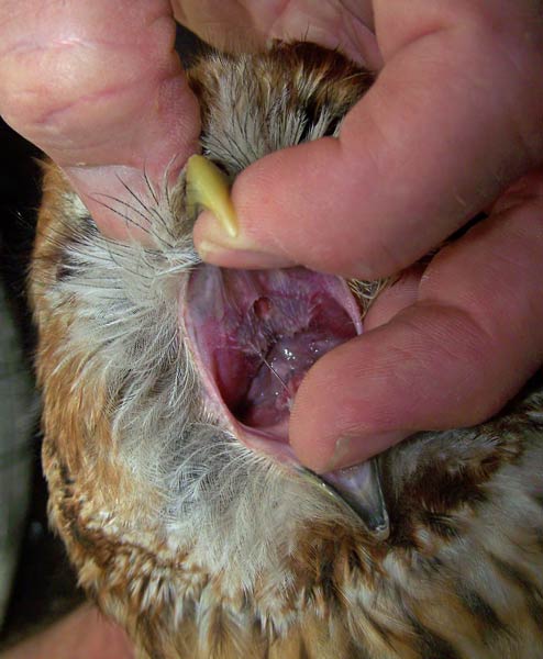 junge Waldohreule in der Greifvogelpflegestation hat schon zwei kleine Hörnchen auf dem Kopf ... über unsere wildlebenden → Waldohreulen im Glemstal |