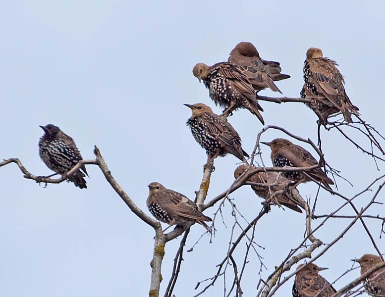 Rechts im Bild: Frisch ausgeflogenen Staren fehlt der Metallglanz, der