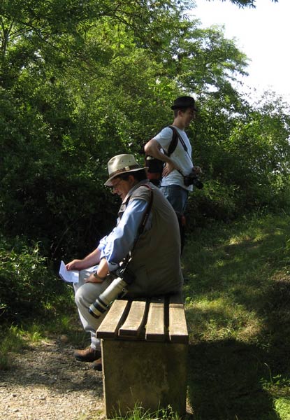 Tom studiert auf der Bank am Siegfriedsfels einen Artikel von Johannes