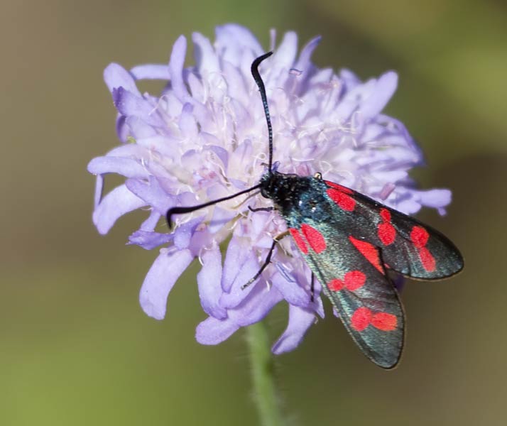 Ein Sechsfleckwidderchen (Zygaena filipendulae) auf Acker-Witwenblume (Knautia arvensis) ...mehr über unsere → Widderchen im Glemstal → Karden-im-Glemstal |