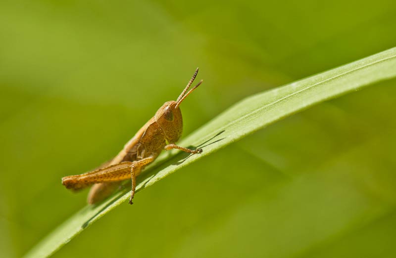 Heuschrecke im Gegenlicht auf dem Siegfriedsfels: der Flügel reicht fast bis an die Hinterleibspitze, also männlich: Gemeiner Grashüpfer (Chorthippus parallelus) ...mehr über unsere |