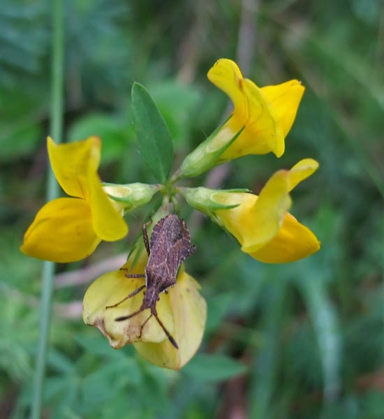 Sichelklee (Medicago falcata) mit Lederwanze Coriomeris denticulatus ...mehr über unsere → Hülsenfrüchtler im Glemstal → Wanzen im Glemstal → Naturdenkmal "Felsenberg I" in Schwieberdingen |