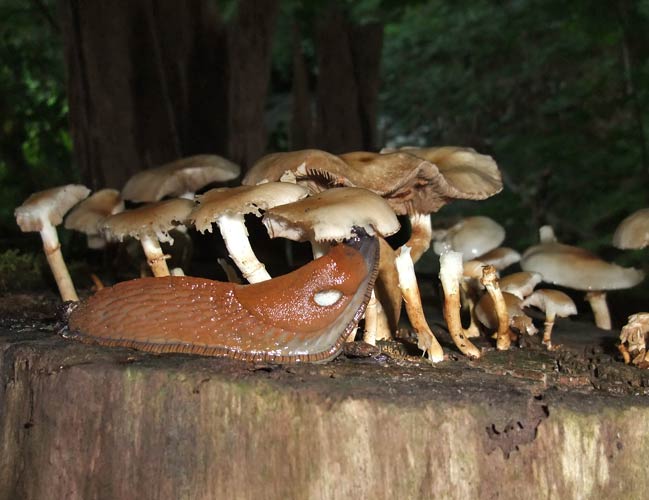 Pilze: Buchenschleimrübling (Oudemansiella mucida) oder nasser, "abgewaschener" Hallimasch (Danke an Norbert Baasner für die Pilzbestimmung in 8 /2012) mit Roter Wegschnecke (Arion rufus) ...mehr über unsere → Schnecken im Glemstal → Pilze im Glemstal → NABU-Teich im Glemstal |