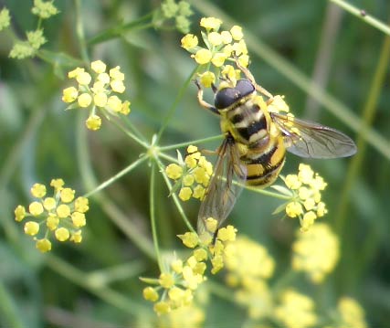 Gemeine Dolden-Schwebfliege (Myathropa florea) auf sichelblättriges Hasenohr (Bupleurum falcatum) ...mehr über unsere → Schwebfliegen im Glemstal → Doldenblütler im Glemstal → Siegfriedsfelsen in Markgröningen |