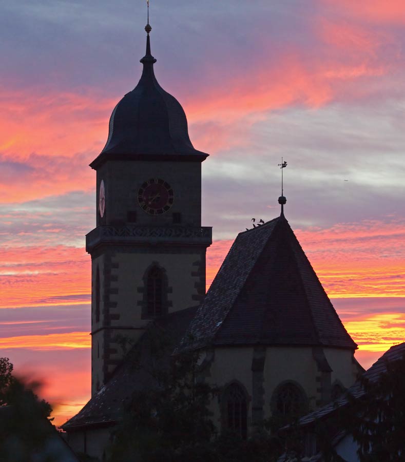 Georgskirche bei Sonnenuntergang (Schön rot, Danke an den isländischen Vulkan Eyafjallajökull) ...mehr über unsere → Georgskirche im Glemstal |