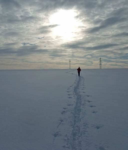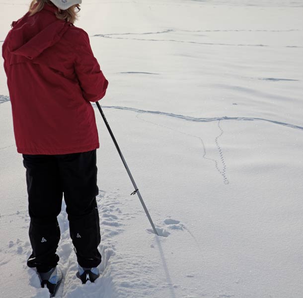 eine Mäusespur auf dem freien Feld. Die Maus kam von unter dem Schnee heraus, lief oben rum und ist an einer anderen Stelle wieder abgetaucht. Schneehöhe an dieser Stelle 28 cm. ...mehr über unsere → Mausarten im Glemstal |