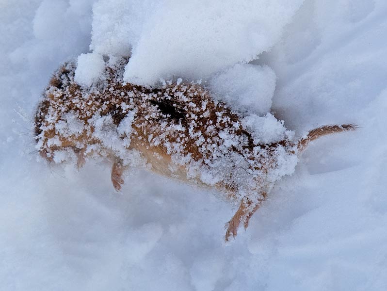 eine tiefgefrorene Maus (Nachts war -15°C): Feldmaus (Microtus arvalis) ...mehr über unsere → Mausarten im Glemstal |