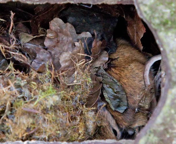 Nistkästen als Winterquartier. Die Gelbhalsmaus passt von der Fellfarbe, der